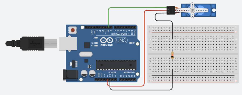 Under finner du et eksempel på et koplingsskjema. I skjemaet er det tegna inn en servomotor som er kopla til en Arduino på punktene 5V, GND og D9. Det er også montert en motstand på 1 kΩ (kiloohm) i GND-kretsen.